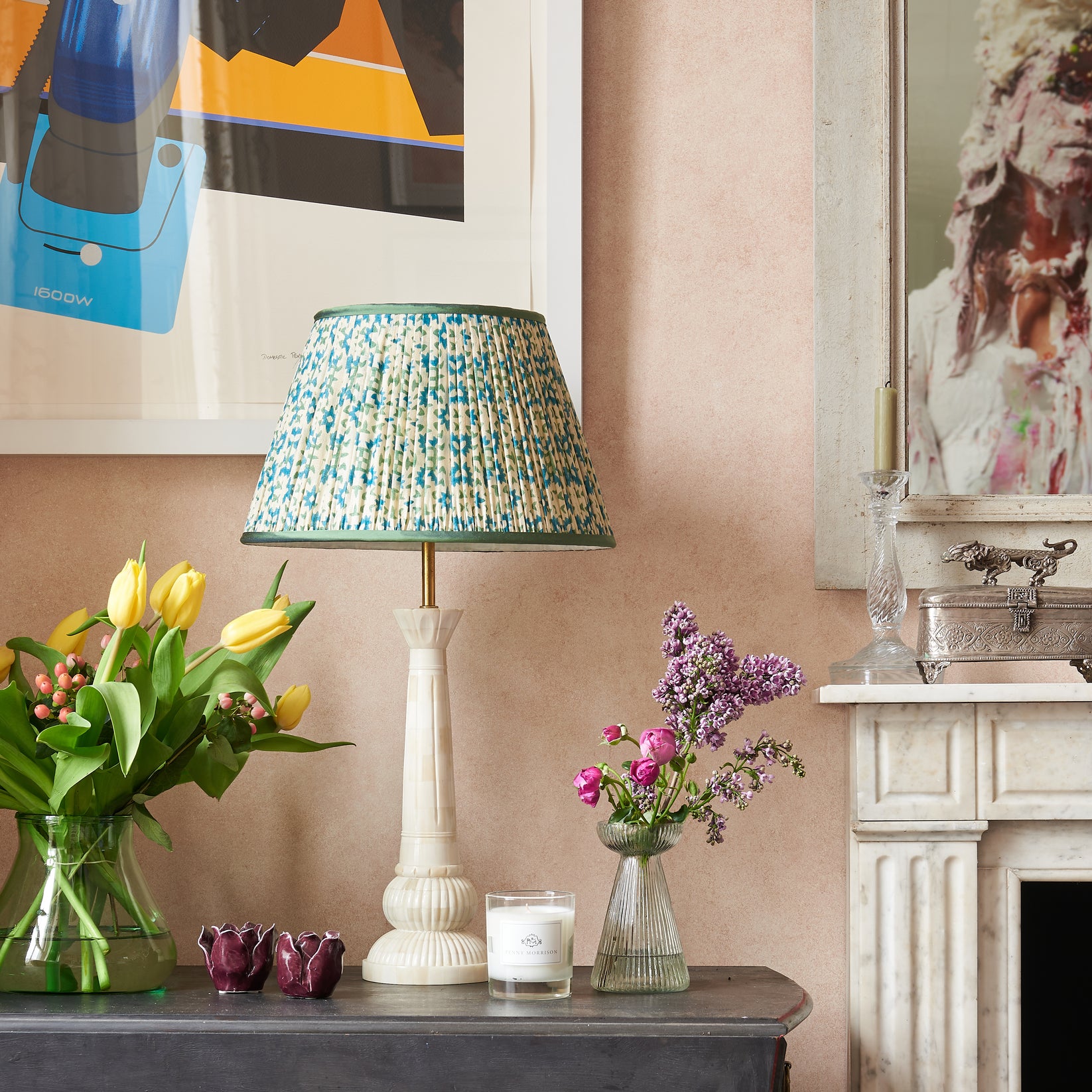 This lampshade pairs a bold and green and turquoise flower pattern with a co-ordinating green trim. This lampshade is handmade in England from pleated hand block printed silk sourced from India.
