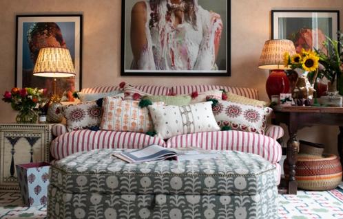 Classic florals on the walls can be tempered by the ever-versatile Ticking Stripe weave, or by abstracts inspired by the block printing techniques favoured in India. Pattern mixing is, for us, far more effective than pattern-matching, and a much less restrictive choice.