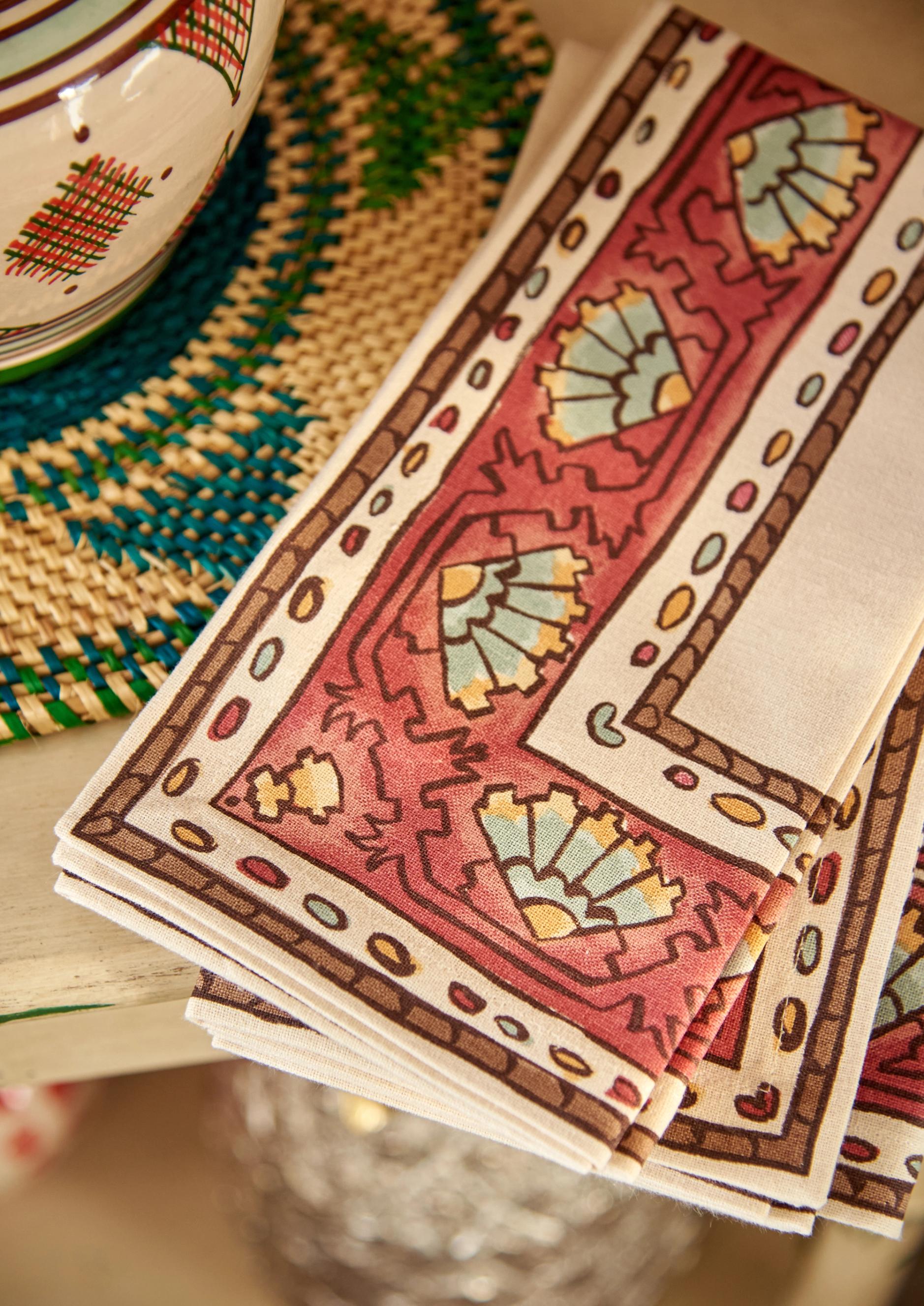 Our Palma tablecloth has been designed with inspiration from an antique hand-painted fabric from Morocco, featuring a graphic of a palm tree and coordinating geometric pattern. The design has been reimagined into a bordered tablecloth, where the palm trees meet centrally to ornament the table.