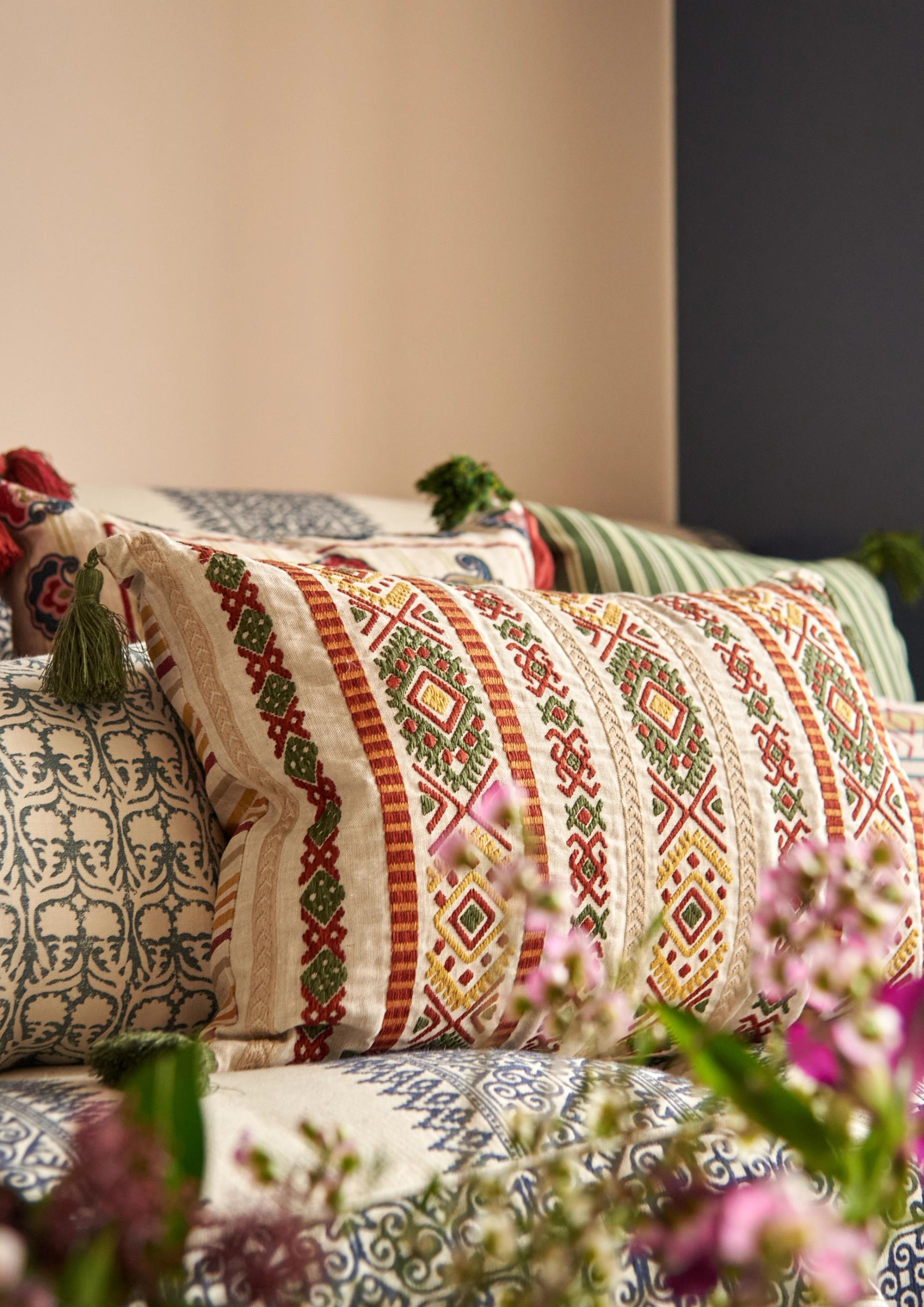 Our Shanti Embroidered cushion was inspired by a piece of vintage silk embroidery. Made using screen-printed natural linen, embroidered in a rich colour palette, and finished with red tassels, this cushion makes for a chic centerpiece on a sofa or armchair.