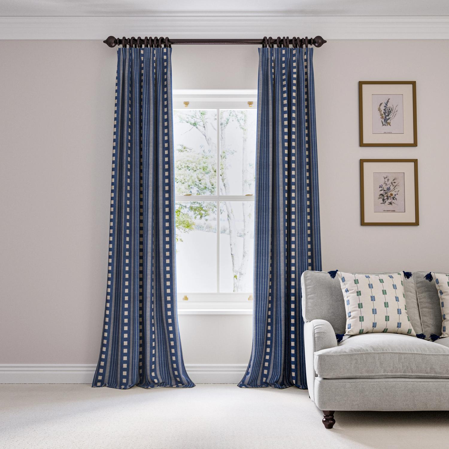 For this, a much smaller print in complementary colours will work well for the tieback, so that it’s not ‘competing’ for attention with the curtains themselves.
