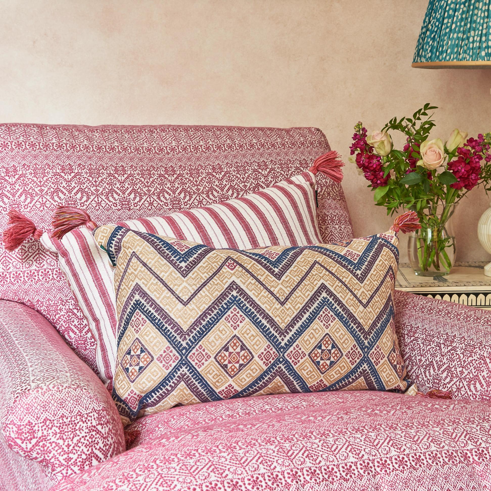 How you do this is entirely down to you. Some people like to throw in a couple of velvets or silks for some variation, but we tend to fall in favour of the texture created by embroidery – those three-dimensional motifs are the ideal sensory garnish – or tassels and trims that offer a more definitive border to the edges of the cushions they’re placed on.
